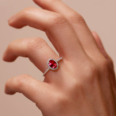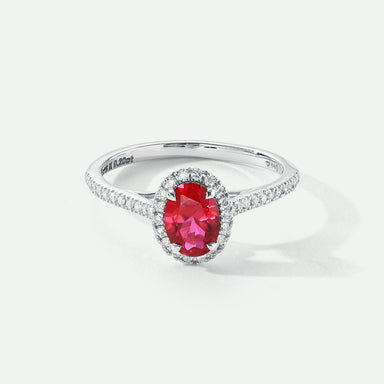 Our lab grown ruby and diamond Rosalind ring is set with a rich created red ruby centre stone framed by a halo of pavé lab grown diamonds.Exquisite...