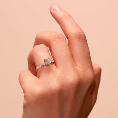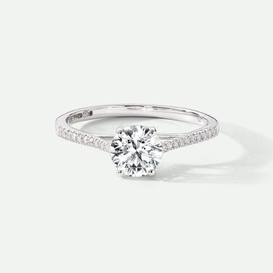 Our Margot ring is superbly crafted in 18 carat white gold and features a round brilliant cut diamond solitaire and pavé set shoulders. This gorgeo...