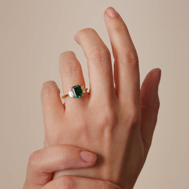 Our stunning Murphy three stone ring is set with a bright, beautiful created emerald centre stone and two dazzling lab grown diamonds. Exquisitely...